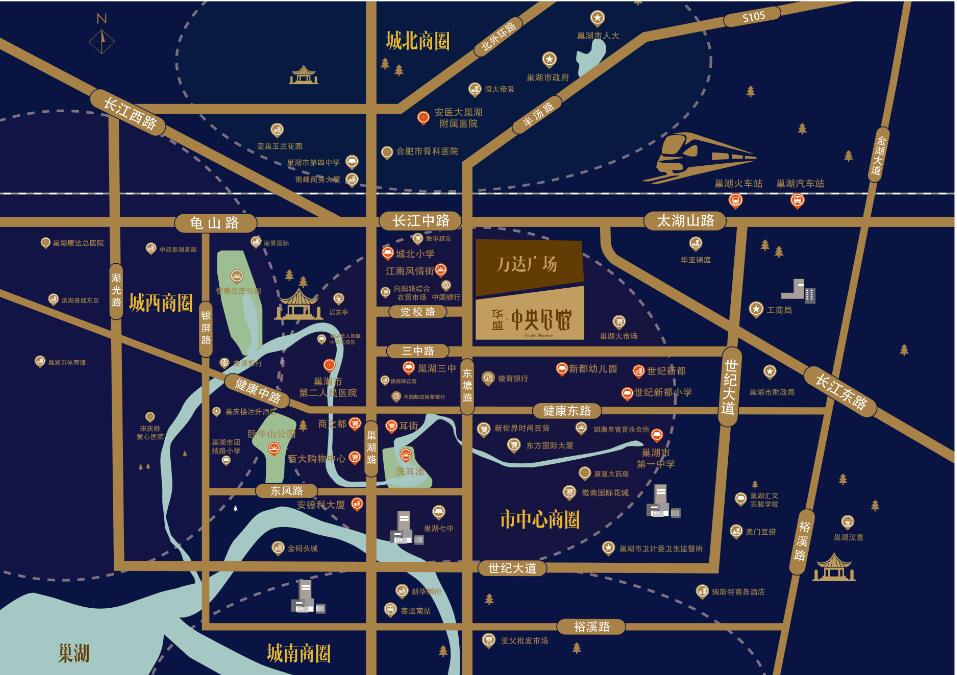 华盛•中央公馆:华盛•中央公馆是由米兰平台开发建设的位于巢湖的首个高端项目,项目位于东塘路与长江中路交口(向南200米),万达广场南侧,总用地面积约54亩,绿化率40%。该项目毗邻巢湖最大的商业综合体巢湖万达广场,真正的主城心,繁华里。项目周边交通便利,长江中路、世纪大道环绕,优质学校、医院、菜市场等生活配套齐全,让业主畅享繁华都市生活。