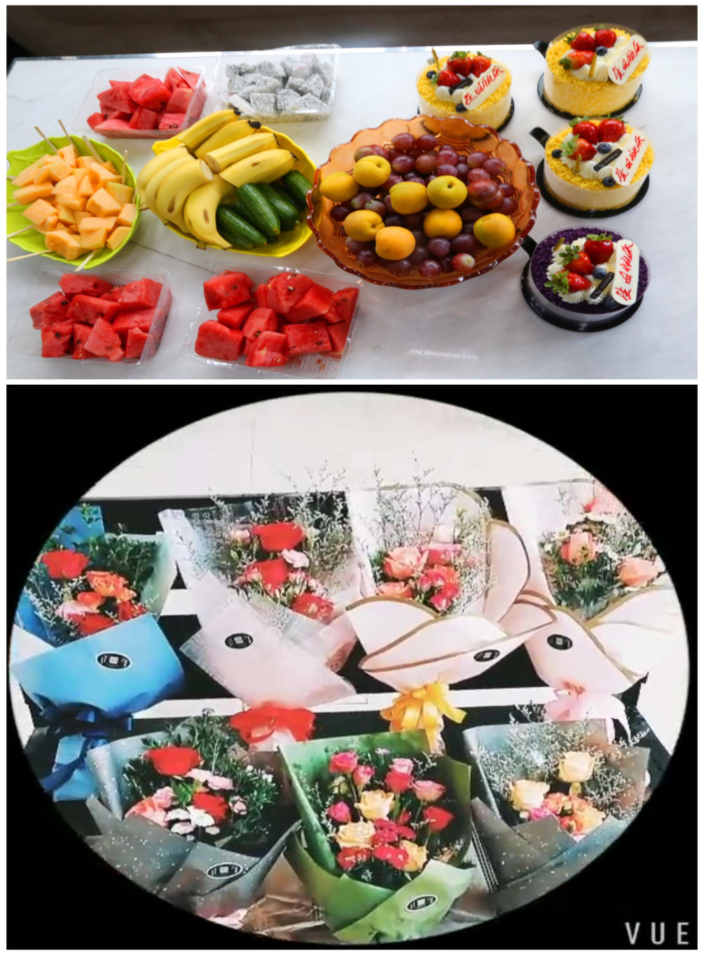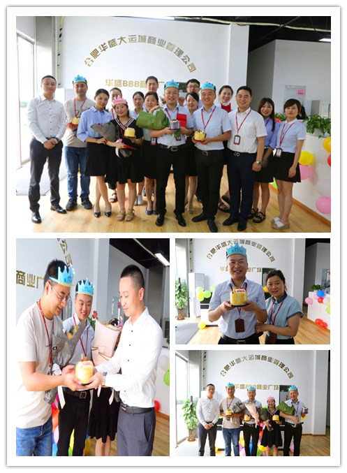 在华盛BBB商业管理公司,在商管公司同仁的见证和祝福下,商管公司总经理宋卓涛为寿星们送上鲜花和蛋糕,集团人力资源部负责人朱霞军为寿星们送上红包和贺卡,并送上集团公司的祝福。