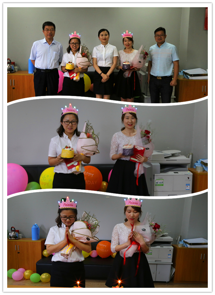 集团成本控制部办公室传出阵阵歌声,集团副总裁李莉为寿星嵇虹和刘影送上鲜花,副总裁赵立春为寿星送上贺卡和礼金,副总裁谢俊国为寿星送上生日蛋糕。集团领导同时送出祝福,祝大家生日快乐,希望在华盛燃烧自我,努力工作。