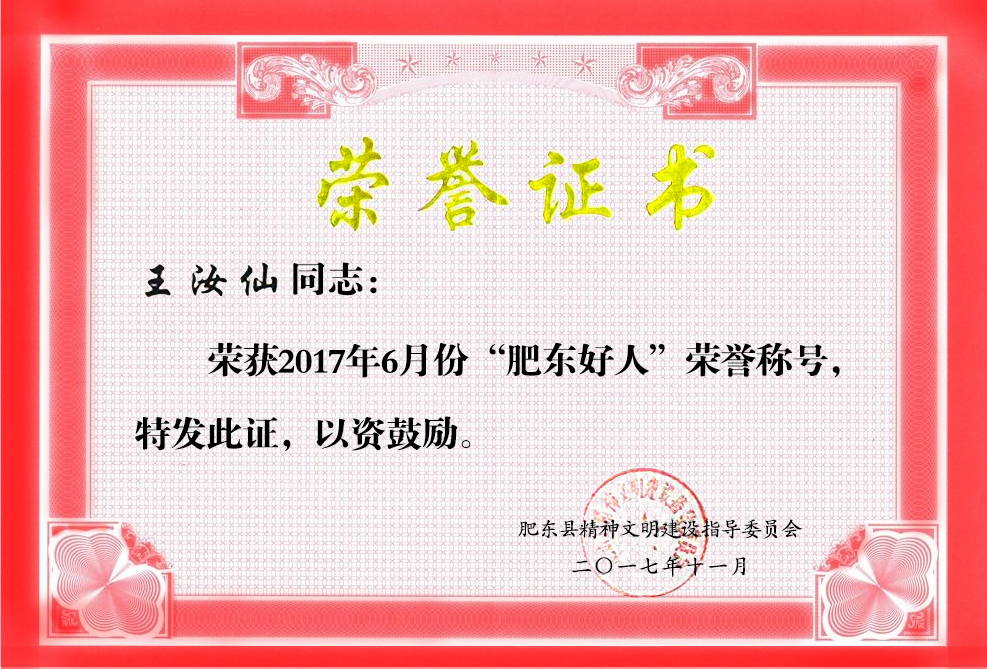 董事长王汝仙荣获“肥东好人”荣誉称号