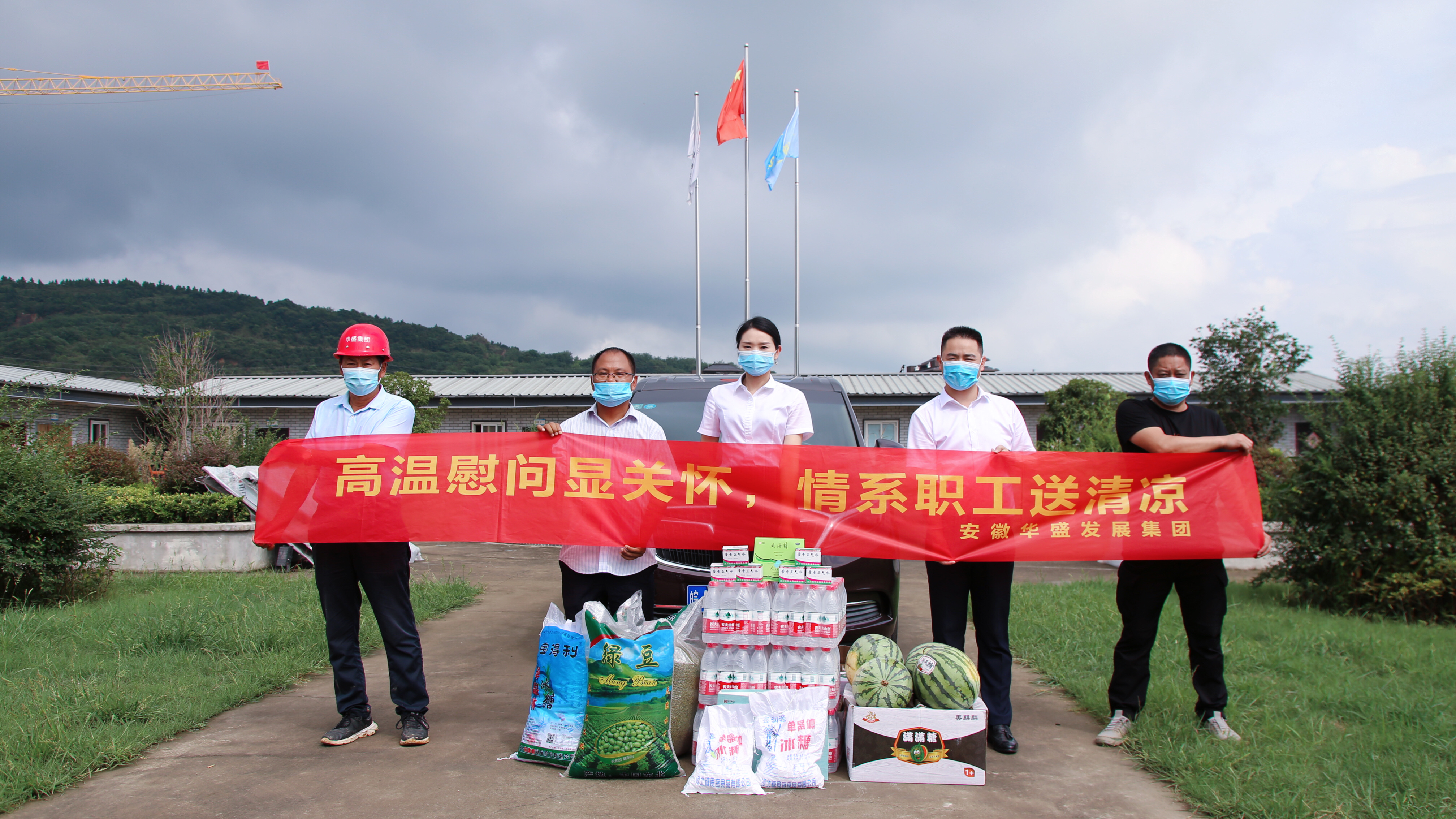 2021年8月11日,立秋刚过,骄阳似火。为做好高温期间防暑降温工作,保障一线员工安全健康地渡过高温期,集团公司常务副总裁余安云、副总裁李莉、集团人力行政中心来到集团各分、子公司和项目部工地,向奋斗在基层一线的员工们发放了藿香正气水、西瓜、冰糖、绿豆和风凉油等防暑降温物品。